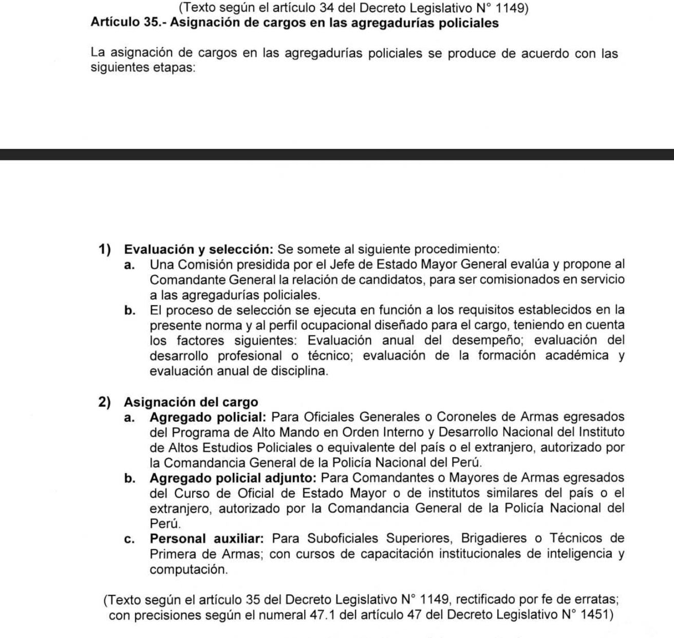 Si bien la resolución de nombramiento de “La Sombra” cita el Decreto Legislativo N° 1149, también señala que se aplicaron las precisiones realizadas a dicho dispositivos a través del Decreto Supremo N° 006-2024-IN, donde se indica que la asignación para el “personal auxiliar” de las Agregadurías está dirigido para “Suboficiales Superiores, Brigadieres o Técnicos de Primera de Armas; con cursos de capacitación institucionales de inteligencia y computación”.