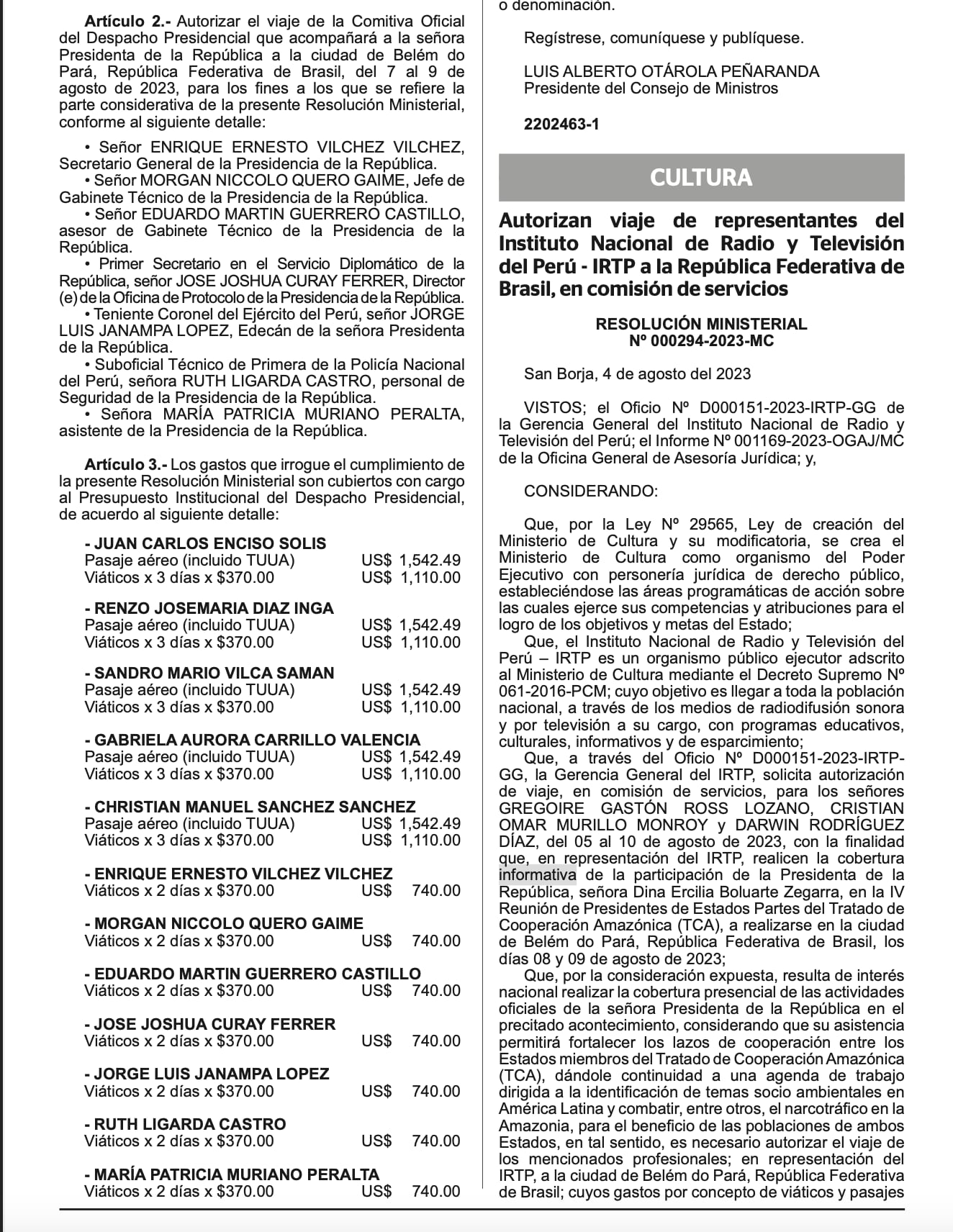 El documento oficial lleva la rúbrica de la presidenta Dina Boluarte; el ministro del Interior, Juan José Santiváñez; y del ministro de Relaciones Exteriores, Elmer Schialer Salcedo.