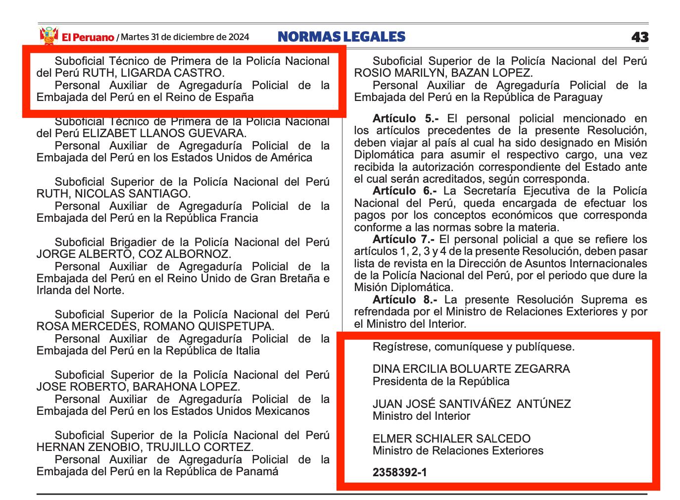 El gobierno de Boluarte Zegarra incluyó a la subalterna en una lista de diversos efectivos policiales que fueron asignados en Misión Diplomática, adscritos al Ministerio de Relaciones Exteriores, por un período de dos años.