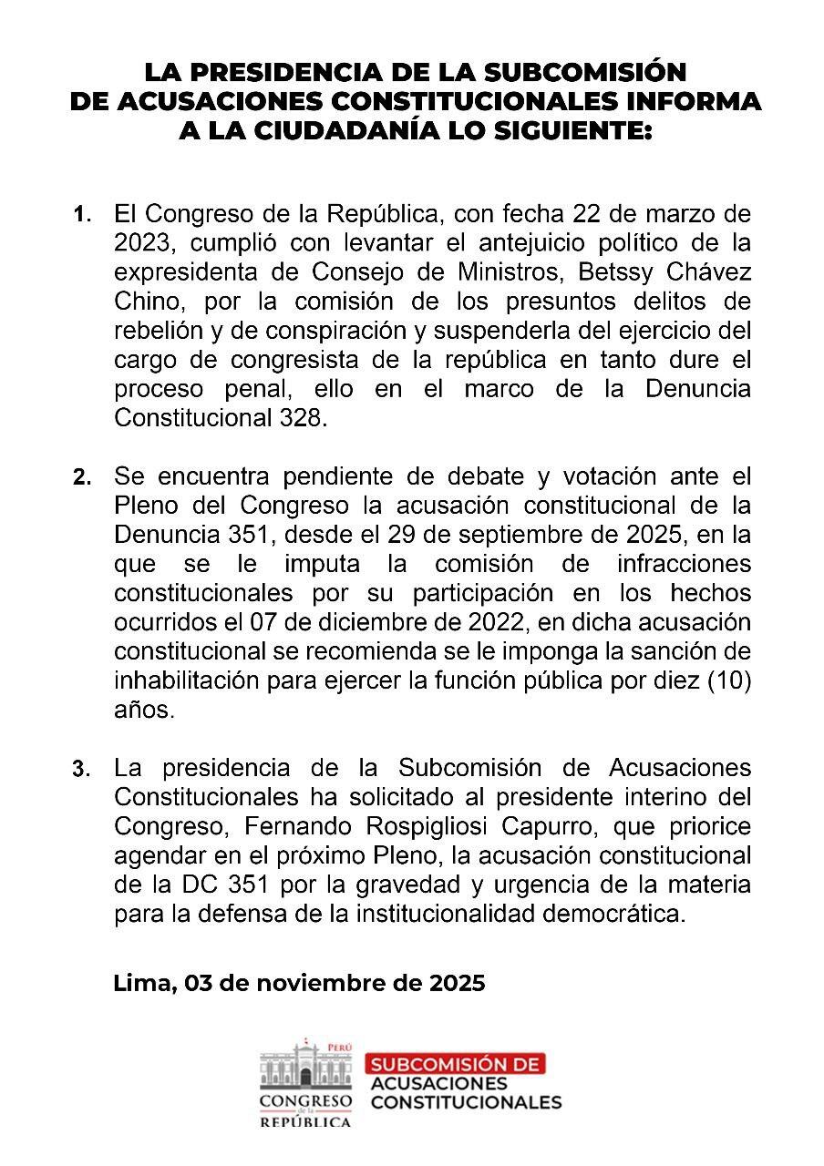 “La presidencia de la Subcomisión de Acusaciones Constitucionales ha solicitado al presidente interino del Congreso, Fernando Rospigliosi Capurro, que priorice agendar en el próximo Pleno la acusación constitucional de la DC 351 por la gravedad y urgencia de la materia para la defensa de la institucionalidad democrática”, señala el pronunciamiento difundido este 3 de noviembre.