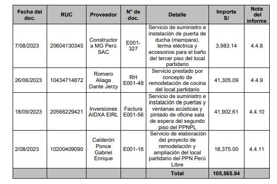 Además, el partido pagó S/41.902,61 a la empresa Inversiones Aidxa EIRL por el servicio de instalación de puertas, ventanas acústicas, drywal y pintado de oficina que se encontrarían en mal estado.