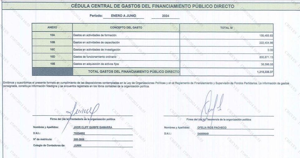 Ese año, además, el partido abonó Cerrón un pago mensual de casi S/ 12 mil soles en efectivo y la ONPE cuestionó que la transacción no haya sido bancarizada.