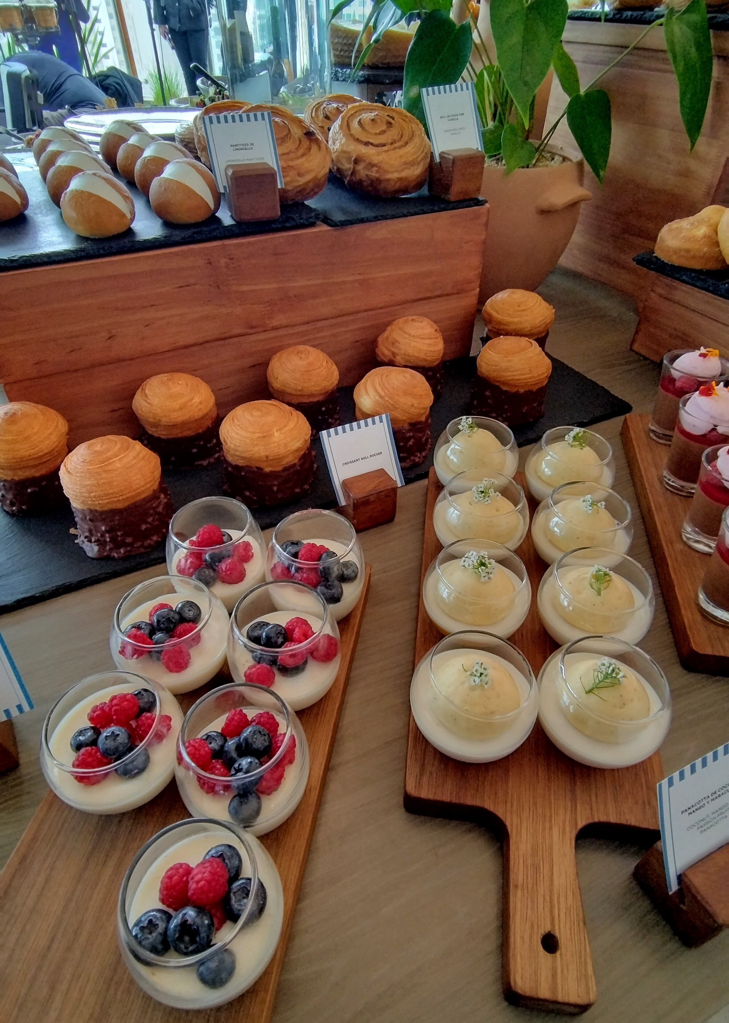Uno de los fuertes es la bollería y pastelería. Con masas deliciosas, formas encantadoras y rellenos generosos y curiosos, encontramos opciones como un marittozo de limoncello, un panecillo redondo relleno de crema y una salsa ácida y suculenta a base del licor mencionado. El croissant roll rocher es perfecto para los amantes del chocolate, mientras que la pannacotta de vainilla (un dulce de cuchara), es ideal para quienes apuestan por sabores más suaves pero no menos deliciosos. El flan parisien fue el predilecto, con un relleno abundante y terso, mientras que el exterior era hojaldrado.