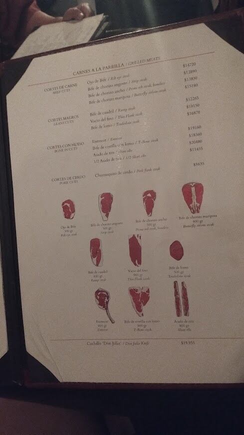 La carta de Don Julio es mucho menos intimidante de lo que se puede pensar y bastante amigable para aquel comensal que no sabe mucho de cortes magros o con hueso, entre otras distinciones. Incluso lleva dibujos de las mismas y no tema preguntar a los mozos que están muy bien capacitados para resolver cualquier duda.