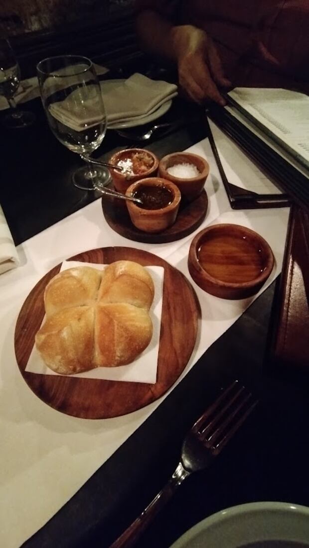 Como piqueo sirven un delicioso pan casero crocante por fuera y de miga suave, que va a la perfección con la salsa criolla que y el chimichurri que entregan en la mesa. También ofrecieron aceite de oliva. El toque especial es la sal gruesa, que sabemos es para sazonar la carne a nuestro gusto.