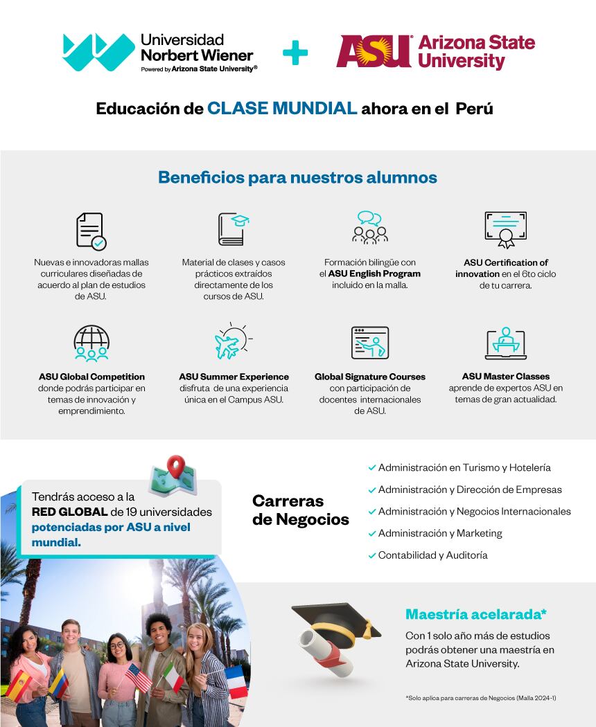 Desde el 2023, la Universidad Norbert Wiener es la única universidad del Perú con una alianza estratégica con Arizona State University (ASU), universidad número uno en innovación en Estados Unidos. La Universidad Norbert Wiener ha diseñado nuevas e innovadoras mallas curriculares de acuerdo a los planes de estudio de las carreras de ASU, brindándoles a sus estudiantes material de clase y casos prácticos extraídos directamente de los cursos de la universidad norteamericana.