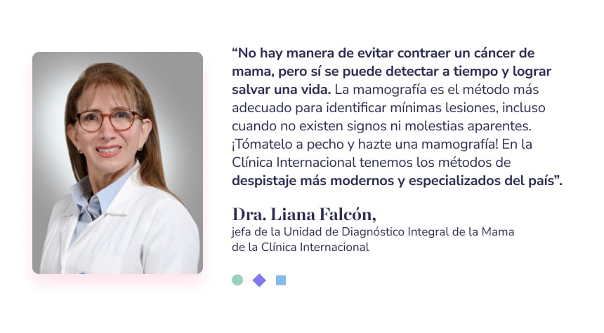 Pero ¿qué ayudó a que Carla pudiera tratar el cáncer en su etapa más temprana? Una mamografía: examen que puede detectar hasta lesiones anómalas imperceptibles. Como afirma la Dra. Liana Falcón, jefa de la Unidad de Diagnóstico Integral de la Mama de la Clínica Internacional, la mamografía es el único método probado que ha disminuido las muertes por cáncer de mama en mujeres mayores de 40 años en el mundo, porque permite la detección temprana y se debe practicar una vez al año.