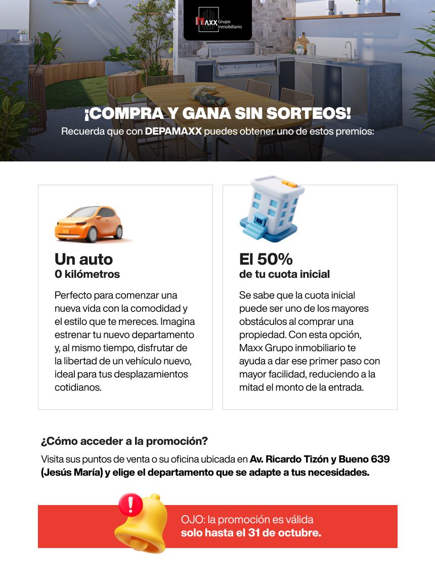MAXX Grupo Inmobiliario lanza DEPAMAXX, una oferta única diseñada para recompensar a sus clientes por su preferencia con un auto 0 kilómetros o el 50% de la cuota inicial (máximo del 10% del valor del departamento) al adquirir un departamento en Jesús María, ubicado en la Residencial Prada (Av. Tizón y Bueno 639). El premio es para las seis primeras separaciones de departamentos. ¡Esta es tu oportunidad!