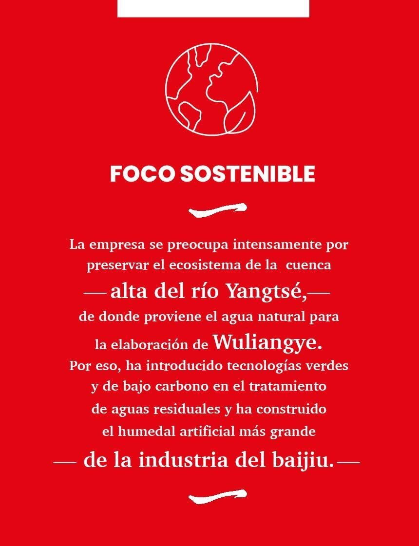 La marca es la primera “Destilería Cero Carbono” en la industria del baijiu, al integrar principios de desarrollo verde a lo largo del ciclo de vida del producto, desde la siembra hasta el envasado. Además, a través del primer proyecto de cogeneración de biomasa de residuos de destilería del mundo, la marca logró transformar los residuos de destilería en energía.