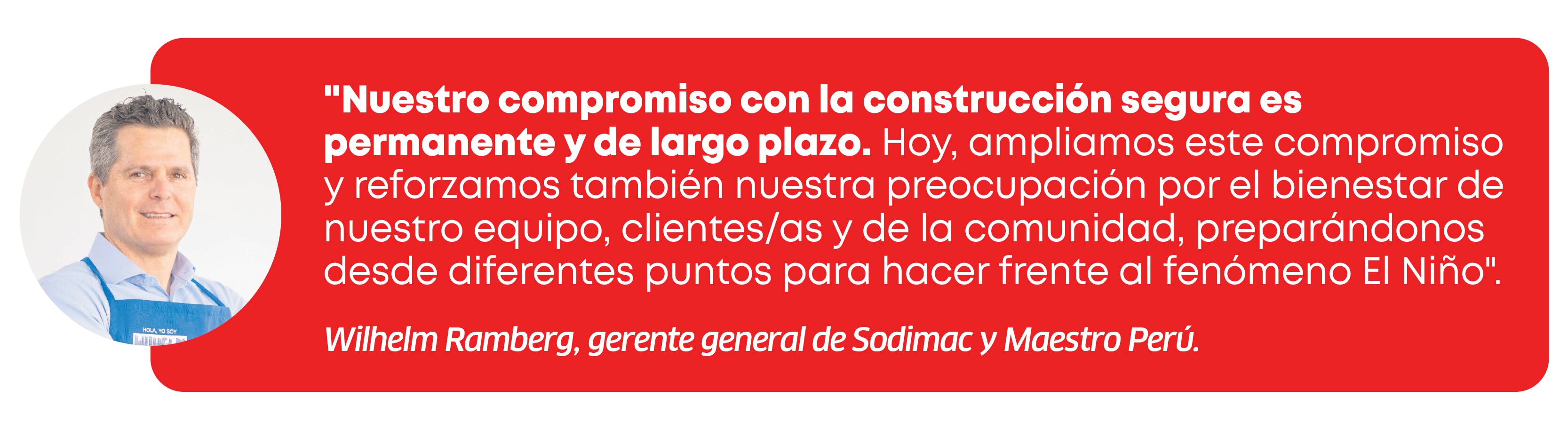 “Es ante este escenario que impulsamos ‘Todos Somos Brigada, Construye Bien’, que busca capacitar e informar sobre medidas orientadas a la reducción y rehabilitación de los potenciales estragos que el fenómeno El Niño tendrá en las viviendas e infraestructura”, destaca Wilhelm Ramberg, gerente general de Sodimac y Maestro Perú.