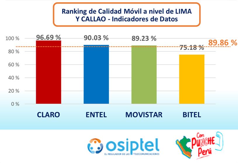 Asimismo, Claro lideró el ranking de indicadores de datos, que mide la calidad del internet móvil, con un 96,69% en Lima Metropolitana y Callao.