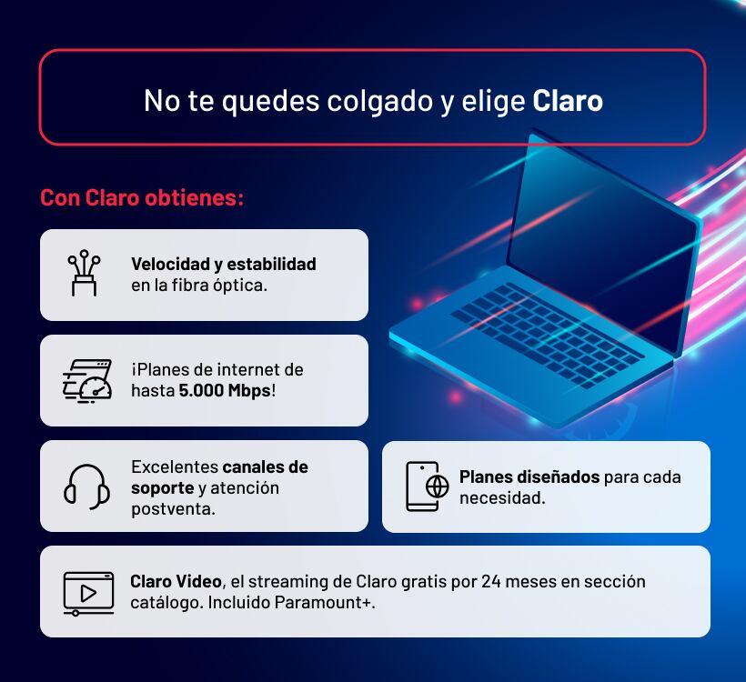 El soporte e innovación es otra gran ventaja de Claro, que le brinda rapidez y estabilidad a su fibra óptica. Incluso, un nuevo hito para la empresa, es implementar una nueva tecnología que le permite ofrecer a sus clientes planes de hasta 5.000 Mbps.