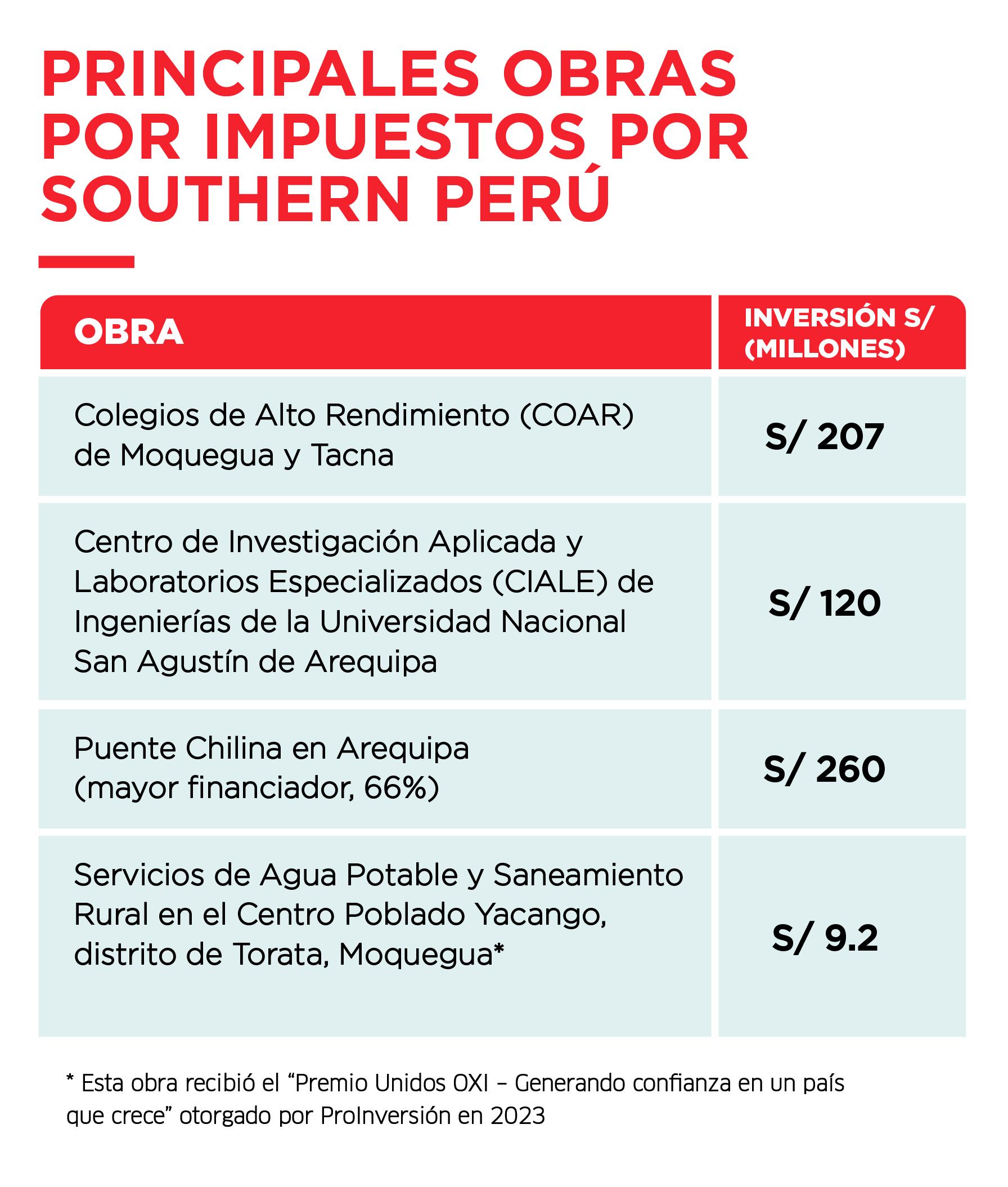 En adición, Southern Perú se ubica en el Top 5 entre las empresas con mayores adjudicaciones y ejecuciones de Obras por Impuestos, según datos de ProInversión a marzo de 2025. Las inversiones de la compañía bajo esta modalidad ascienden a S/ 1,205 millones y constituyen una señal clara de su compromiso con el desarrollo de las regiones donde tiene operaciones y proyectos: Arequipa, Cajamarca, Apurímac, Moquegua y Tacna.
