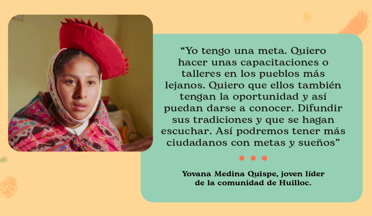 En el caso de Yovana, gracias a las habilidades adquiridas con el tiempo, ha logrado ser presidenta de una organización de niñas, niños y adolescentes de su comunidad, la cual lleva el nombre de”Inkakunaq Yupin”, Huellas del Inka. A través de esta, ellos buscan promover el liderazgo de los jóvenes y niños de su zona.
