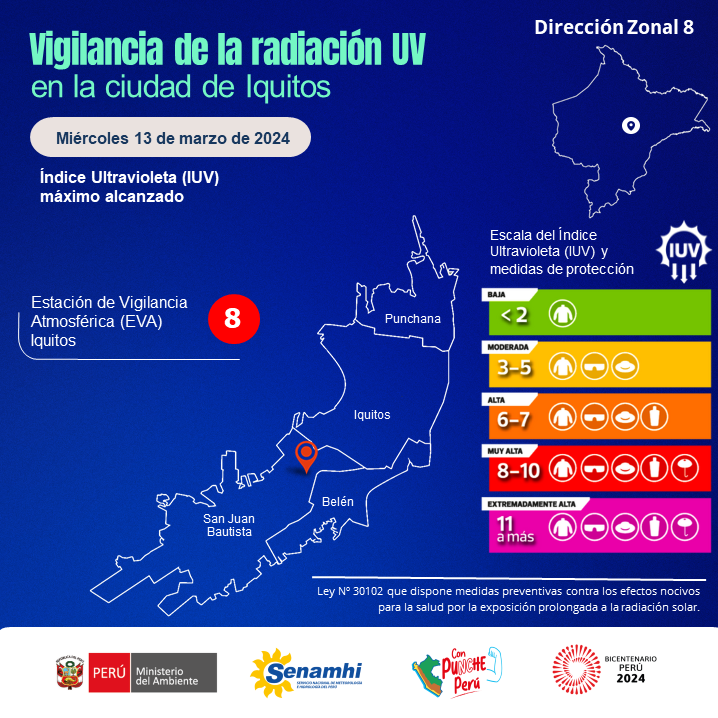 Loreto: Iquitos alcanza Índice Ultravioleta (IUV) “Muy alta”. Estación de Vigilancia Atmosférica Iquitos, ubicada en el distrito de San Juan Bautista, registró un valor máximo del IUV de 8. Utiliza gorro ala ancha, prendas de manga larga y protectores solares.