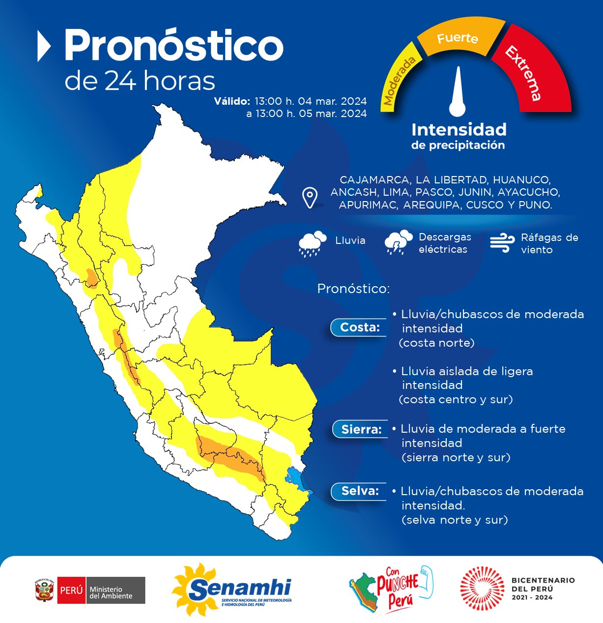 Pronóstico de lluvias en las provincias de Ancash, Apurímac, Arequipa, Cajamarca, Cusco, Huánuco, Junín, La Libertad, Lima, Pasco y Puno.