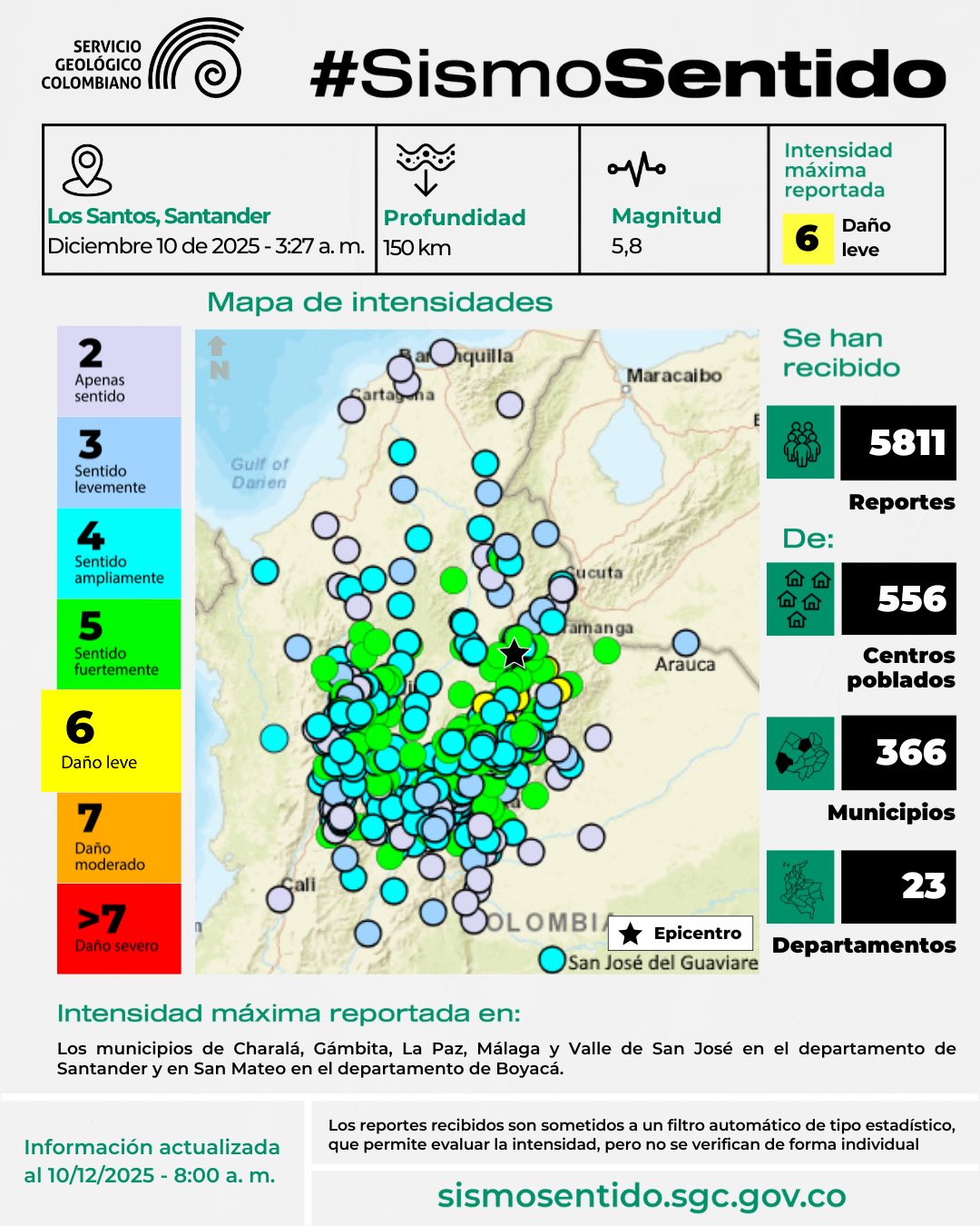 El Servicio Geológico Colombiano (SGC) reporta que Colombia es un país con alta actividad sísmica, registrando un promedio de 80 sismos al día, la mayoría imperceptibles. El área de Los Santos, Santander, es conocida como un "nido sísmico" y es una de las zonas más activas del planeta en cuanto a frecuencia de sismos