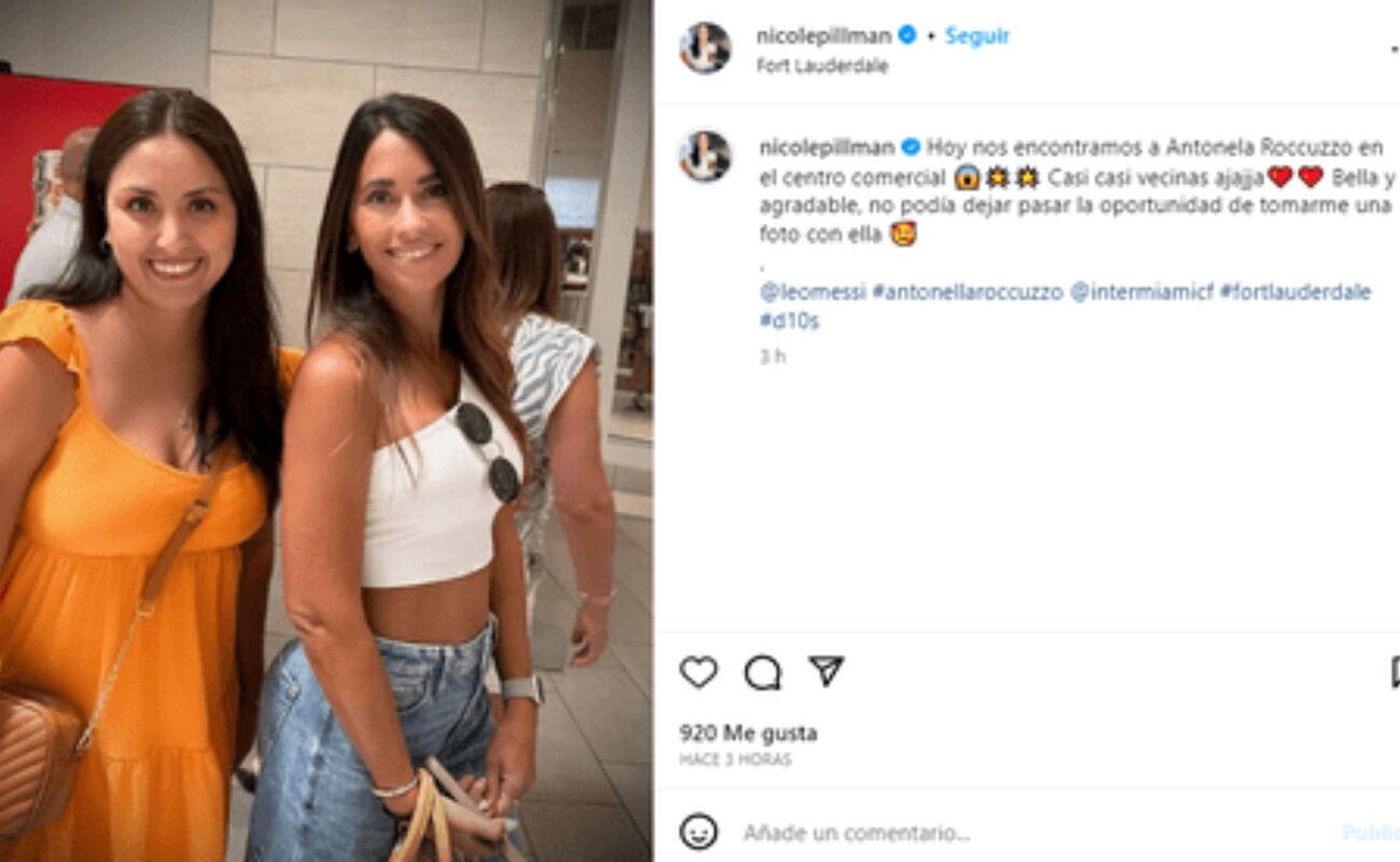 Nicole Pillman por medio de sus redes sociales decidió contar que se encontró con la madre de los hijos de ‘La Pulga’, Antonela Rocuzzo en un centro comercial de Florida, estado donde vive en la actualidad. “Hoy nos encontramos a Antonela Roccuzzo en el centro comercial Casi casi vecinas ajajja Bella y agradable”, escribió la cantante peruana junto a la fotografía.