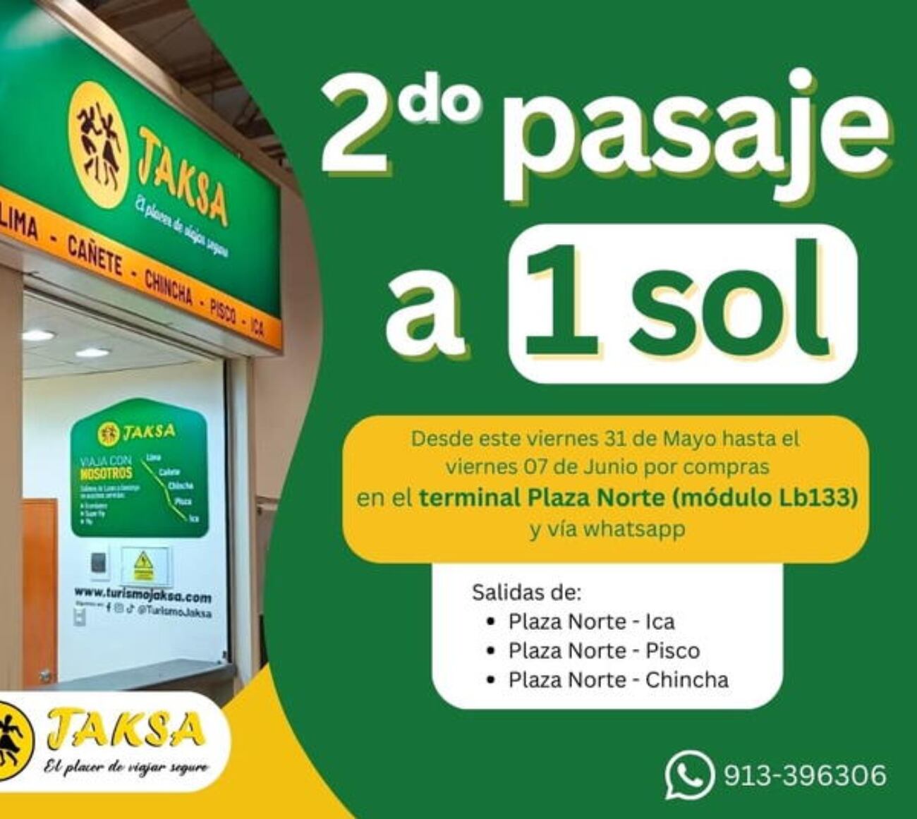 Si estas planeando viajar a visitar a los seres queridos o simplemente disfrutar de las playas, viñedos y cultura de Ica, la empresa de Turismo Jaksa informó a todos sus usuarios que ha lanzado una promoción imperdible por su reciente inauguración del nuevo terminal de buses, que se encuentra situado en Plaza Norte (módulo Lb133). Esta compañía de transporte anunció que la promoción estará vigente desde el 31 de mayo hasta el 7 de junio para las personas que viajarán con un acompañante, es decir, el segundo pasaje costará a solo 1 sol.