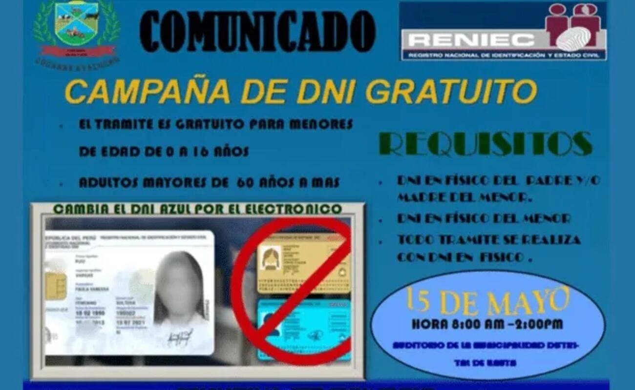 Ayacucho (Llauta): la Municipalidad de Llauta convocó a los padres de familia para que actualicen o registren el DNI de sus hijos de 0 a 16 años o también de 60 años a más totalmente gratis. Según el comunicado de la alcaldía, los padres tendrán que presentar su documento en físico para realizar el trámite de sus menores en el Auditorio de la Localidad distrital de Llauta, este 15 de mayo a partir de las 8.00 a. m. hasta las 2.00 p. m.