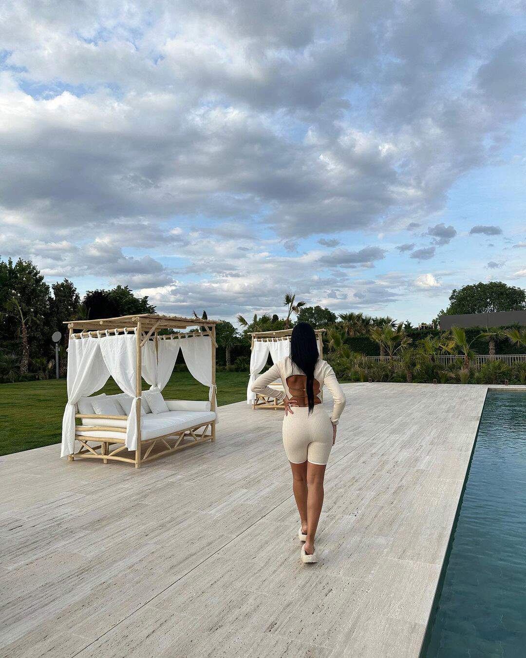 Según la perspectiva y análisis vertido por El Mueble, cada detalle de la mansión está compuesta por una decoración minimalista, cuyos sofás grisáceos adornan la fachada, mientras unas camas de estilo balinés bordean la piscina de grandes dimensiones.