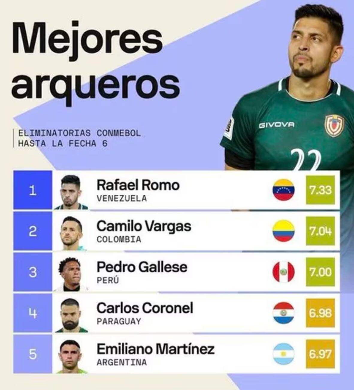 Gallese obtuvo un puntaje de 7, siendo superado por el venezolano Rafael Romo con 7.33 y el colombiano Camilo Vargas con 7.04. A continuación, te presentamos la lista completa de los mejores arqueros sudamericanos: