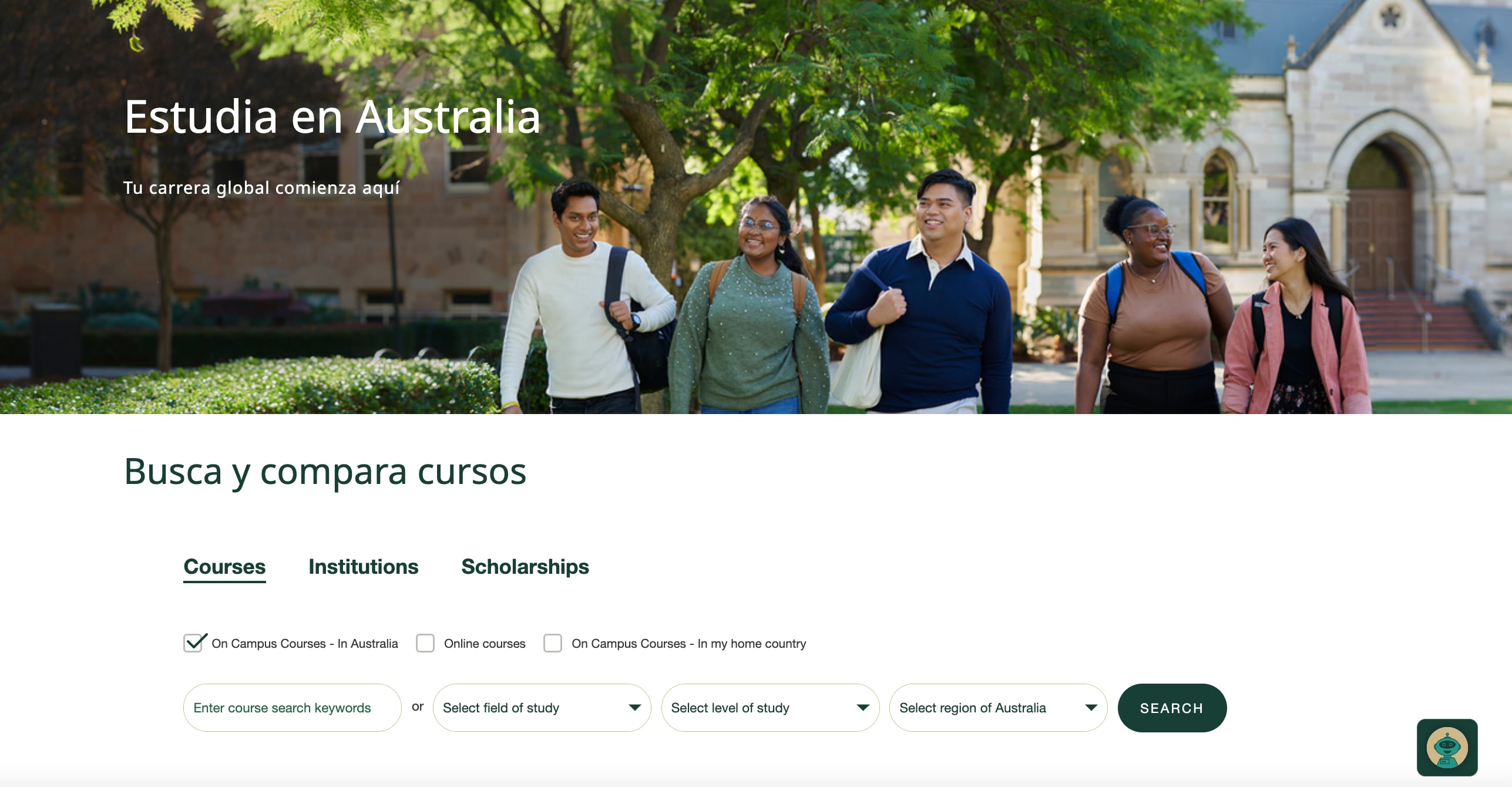 “En esta página www.studyaustralia.gov.au/es puedes encontrar la lista completa de universidades, las becas, los descuentos. Por ejemplo, si quieres estudiar periodismo, buscas con ayuda de la lupita, al igual que en Google, la palabra periodismo o journalism y te va a dar todas las opciones con esta palabra. Esto te permitirá hacer la comparación y elegir cuál es la mejor opción, qué descuento hay, etc.
