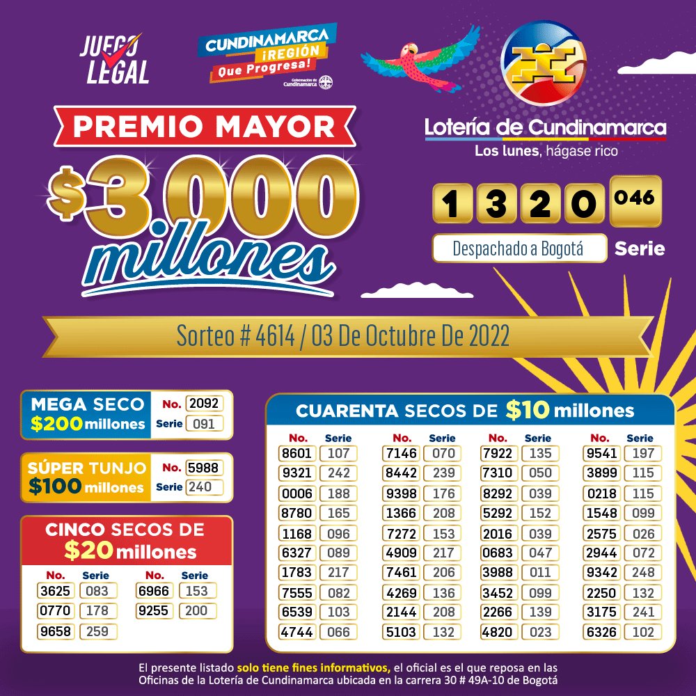 Conoce los resultados de la Lotería de Cundinamarca 4614 , una de las más populares de Colombia y descubre si eres el ganador.