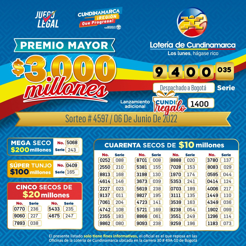 Conoce los resultados del sorteo 4597 del último lunes de la Lotería de Cundinamarca.
