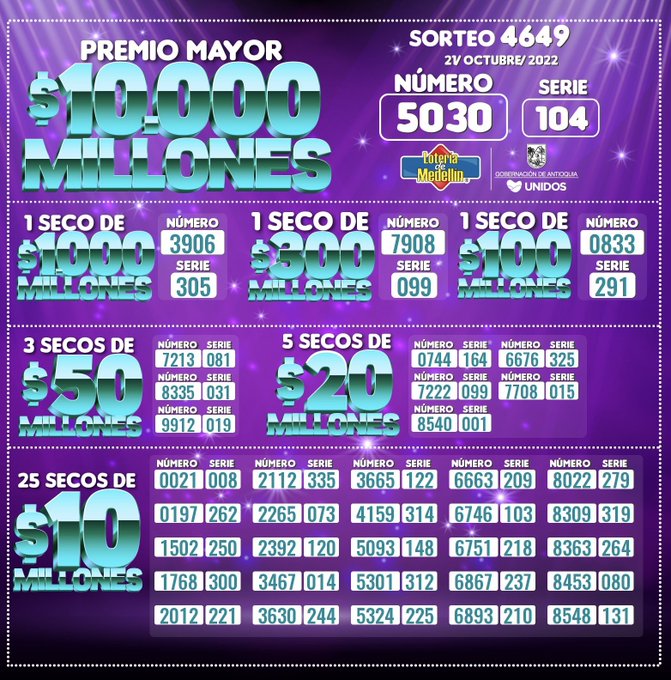 Sigue aquí en vivo los resultados, números y secos ganadores del sorteo 4649 de la Lotería de Medellín, una de las que más paga en Colombia.