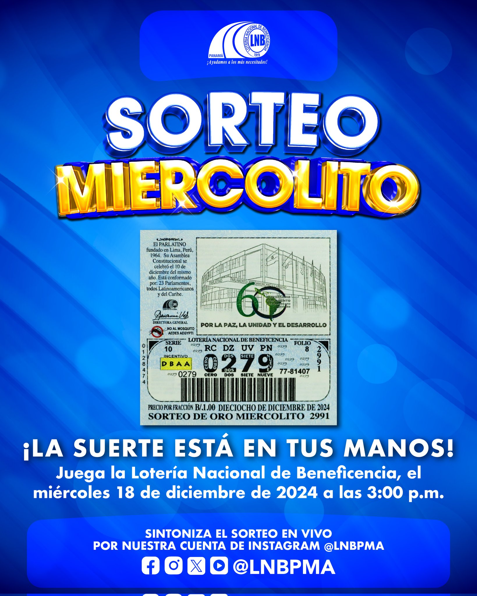La Lotería Nacional de Panamá realizará el sorteo miercolito N°2991 correspondiente al 18 de diciembre de 2024.