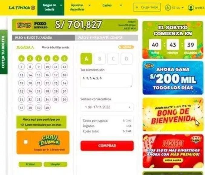 Si deseas, también puedes seleccionar la opción CHAU CHAMBA, participarás con los mismos 6 números, en un segundo sorteo, cuyo premio es de S/ 5,000 mensuales netos durante los próximos 20 años.