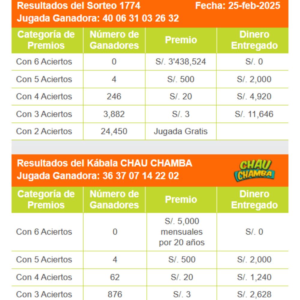 CHAU CHAMBA | Resultados del martes 25 de febrero.