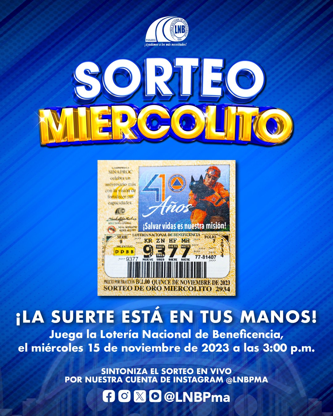La Lotería Nacional de Panamá realizará el sorteo miercolito N°2934 correspondiente al 15 de noviembre de 2023. En esta oportunidad se destaca en su impresión a “41 años de SINAPROC”.
