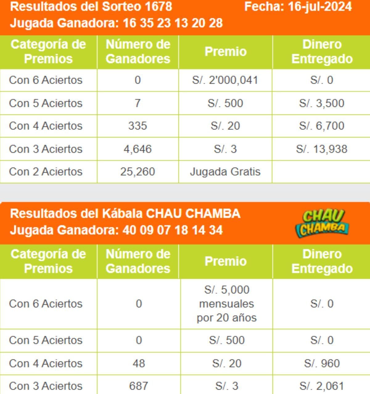 CHAU CHAMBA | Resultados del martes 16 de julio.