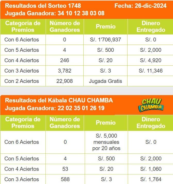 CHAU CHAMBA | Resultados del jueves 26 de diciembre.