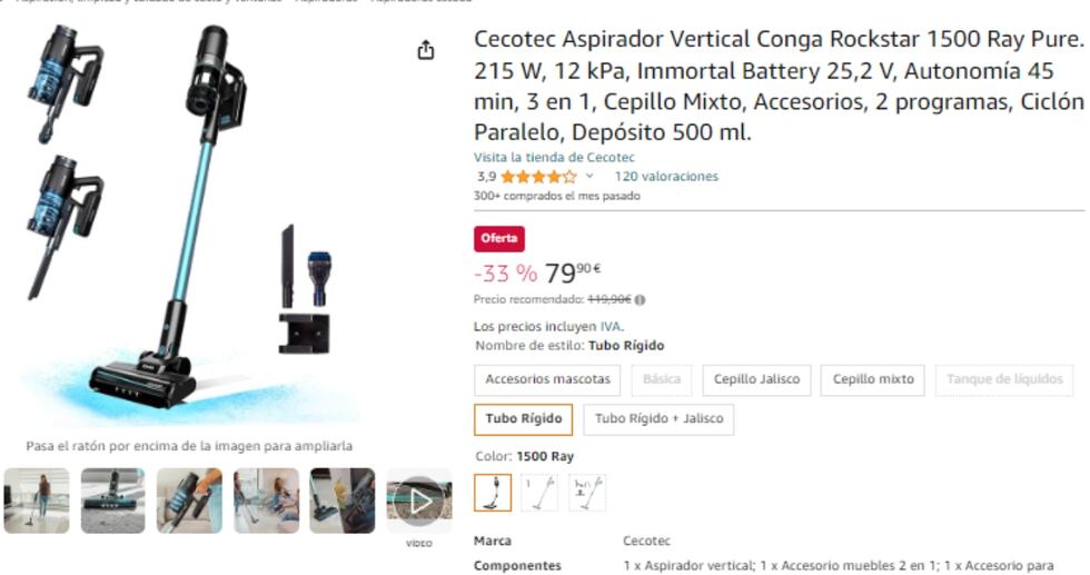 - Conga Rockstar 1500 Ray Pure por 79,90 euros: esta aspiradora inalámbrica con forma de escoba de Cecotec cuenta con un motor sin escobillas con una potencia de 215W que se traduce en una fuerza de succión de 12.000 PA.