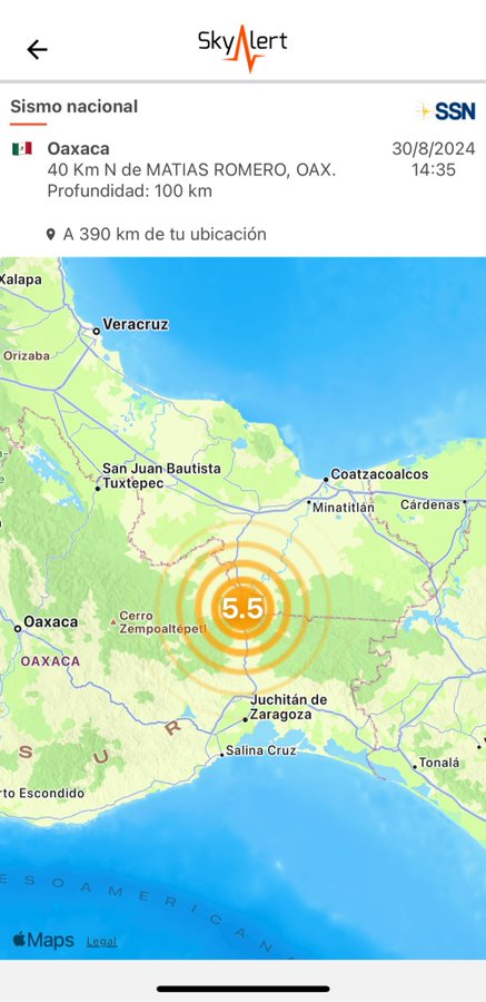 Sismo (magnitud final) 4.8 (SSN) con epicentro entre Matías Romero, Oaxaca, y Acayucan, Veracruz.