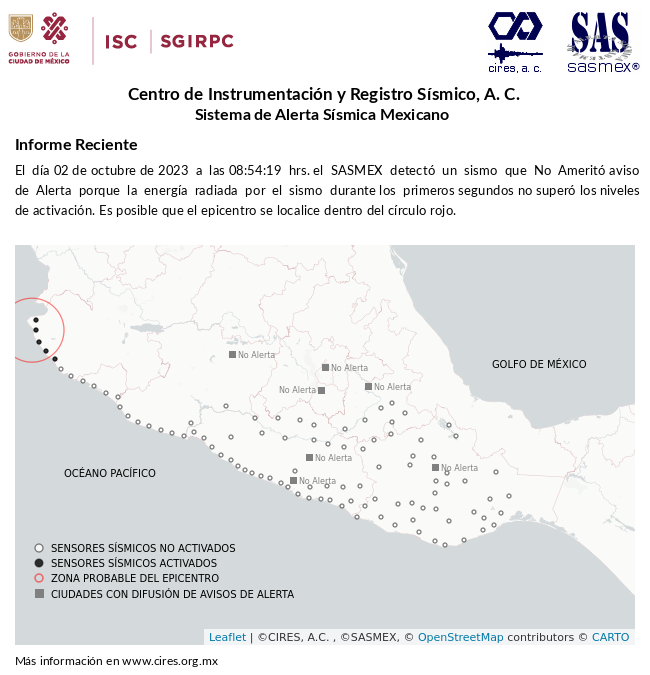 Reporte vespertino de sismicidad 2023-10-02 que incluye todos los sismos localizados de magnitud menor de 4.0 actualizado hasta las 17:00 horas.