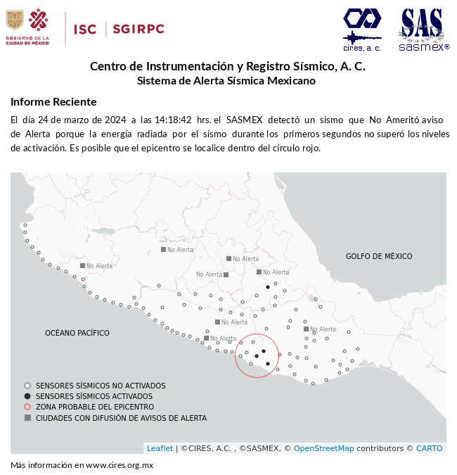 Reporte vespertino de sismicidad 2024-03-24 que incluye todos los sismos localizados de magnitud menor de 4.0 actualizado hasta las 17:00 horas.