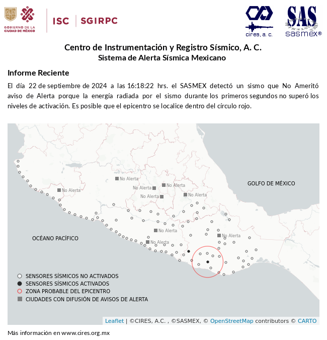 Reporte vespertino de sismicidad 2024-09-22 que incluye todos los sismos localizados de magnitud menor de 4.0 actualizado hasta las 17:00 horas, disponible en: