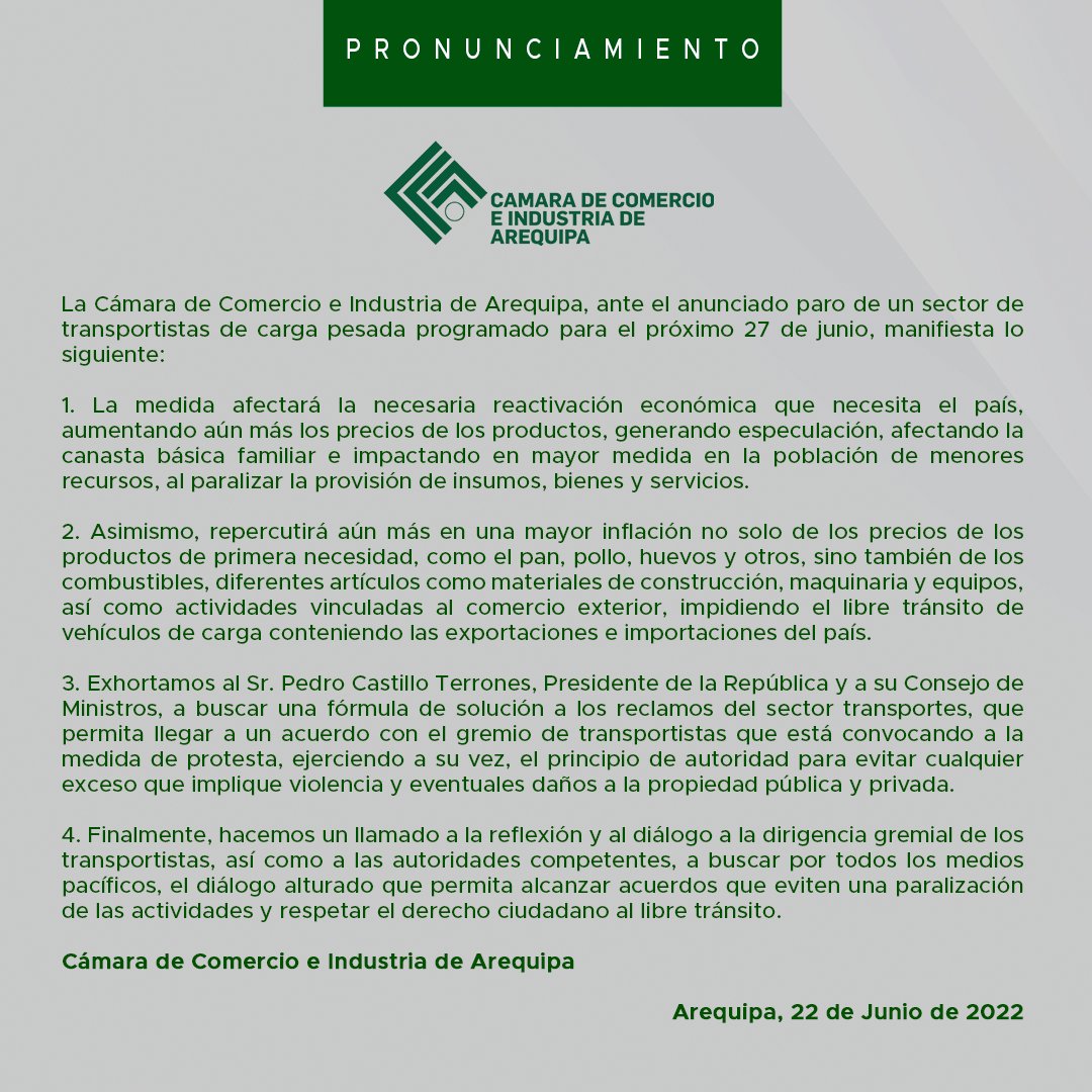 PRONUNCIAMIENTO | La Cmara de Comercio e Industria de Arequipa manifiesta lo siguiente ante el anunciado paro de un sector de transportistas de carga pesada programado para el prximo 27 de junio.#Pronunciamiento #ParoDeTransportistas #CmadaDeComercioArequipa #CCIA #Arequipa pic.twitter.com/TRb9XREkWV
