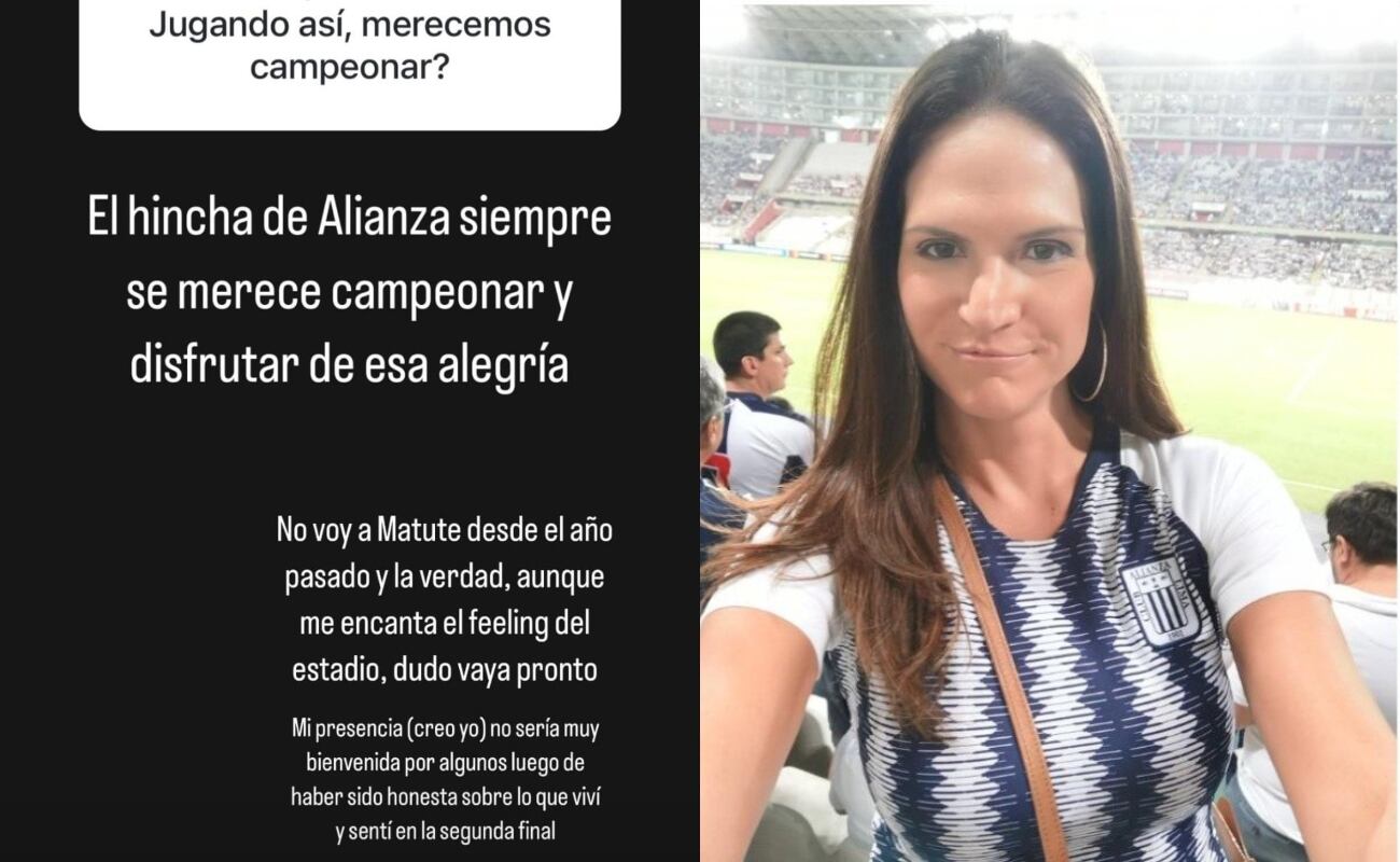 “El hincha de Alianza siempre se merece campeonar y disfrutar de esa alegría”, se lee, ante la pregunta si el conjunto ‘grone’ merecía ganar por lo mostrado en el enfrentamiento contra el ‘vendaval celeste’. Asimismo, confesó que tampoco asiste a Matute debido a las críticas que hizo en la segunda final del año pasado cuando los blanquiazules perdieron ante su clásico rival. “No voy a Matute desde el año pasado y la verdad, aunque me encanta el feeling del estadio, dudo que vaya pronto. Mi presencia (creo yo) no sería muy bienvenida por alguno luego de haber sido honesta sobre lo que viví y sentí en la segunda final”, escribió Álvarez.