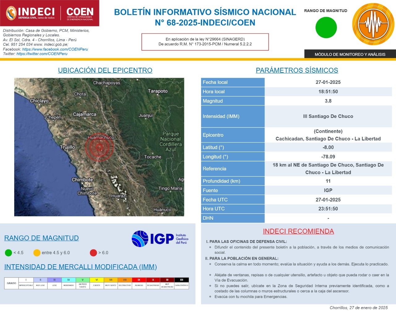 Información de INDECI sobre el sismo a 55 km al SO de Casma, Casma - Áncash.