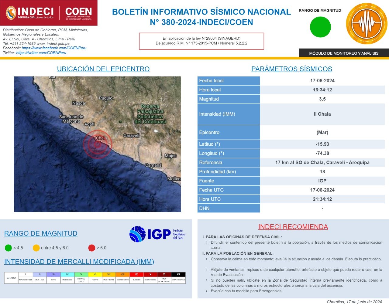 Un sismo de magnitud 3.5 se registró este lunes 17 de junio en Chala, Caravelí, en Arequipa, el segundo en lo que va del día en esa región. De acuerdo al Instituto Geofísico del Perú (IGP), el movimiento telúrico se produjo a las 4:34 p.m.