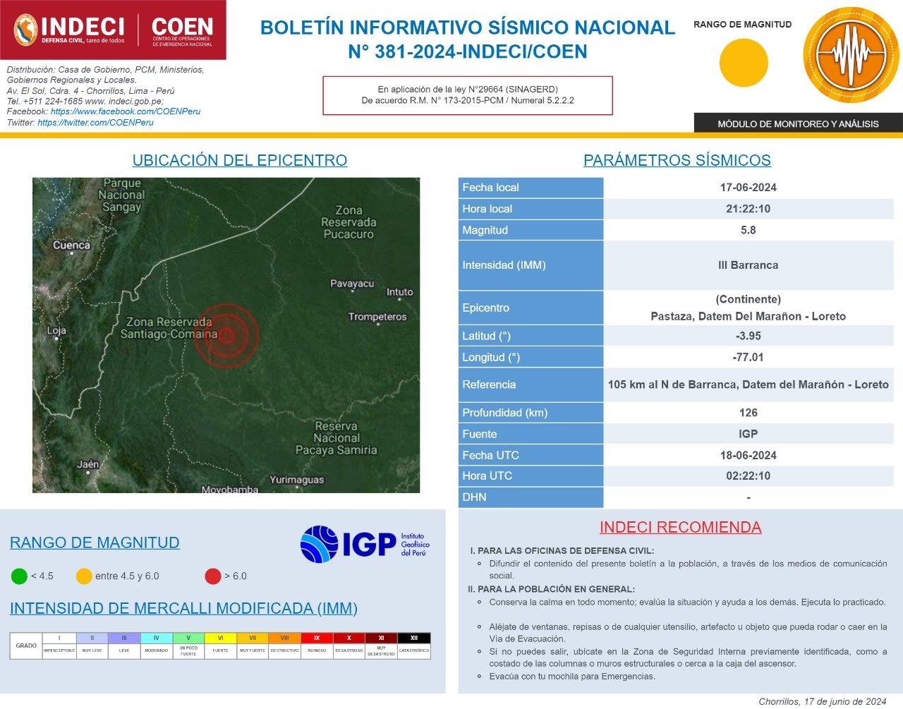 Un sismo de magnitud 5.8 se registró este lunes 17 de junio en Barranca, Dátem del Marañón, en la región Loreto. De acuerdo al Instituto Geofísico del Perú (IGP), el movimiento telúrico se produjo a las 9:22 p.m.