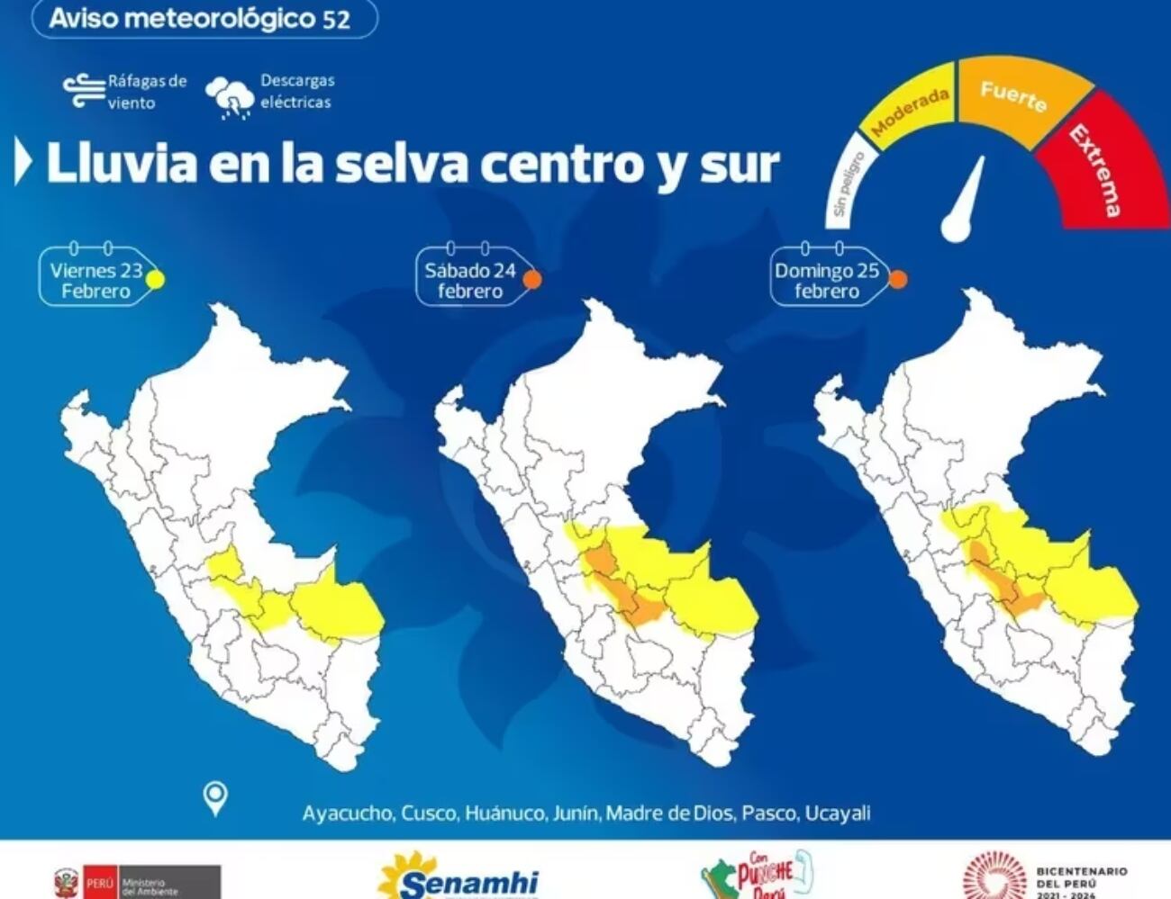 El Senamhi publicó mediante sus redes sociales el aviso meteorológico número 52 que va desde el viernes 23 al domingo 25 de febrero en la cual advierte que en algunas regiones de la selva centro y sur del país sufrirán posibles lluvias de moderada a fuerte intensidad que vendrán con ráfagas de viento y descargas eléctricas.