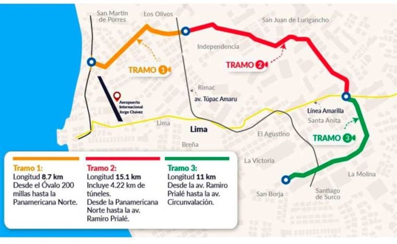 - Tramo 1 (Callao, San Martín de Porres y Los Olivos): Inicia en el óvalo 200 Millas y sigue por las avenidas Elmer Faucett, Canta Callao, Naranjal; se contempla viaducto que cruzará la Panamericana Norte en dirección a Túpac Amaru
