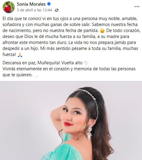 Destacando virtudes, cualidades y atributos propios de la personalidad de ‘Muñequita Milly’, Sonia Morales inicia el post vía Facebook, contando de manera emotiva además que el día que la conoció vio en sus ojos a una “persona muy noble, amable, soñadora y con muchas ganas de sobresalir”.