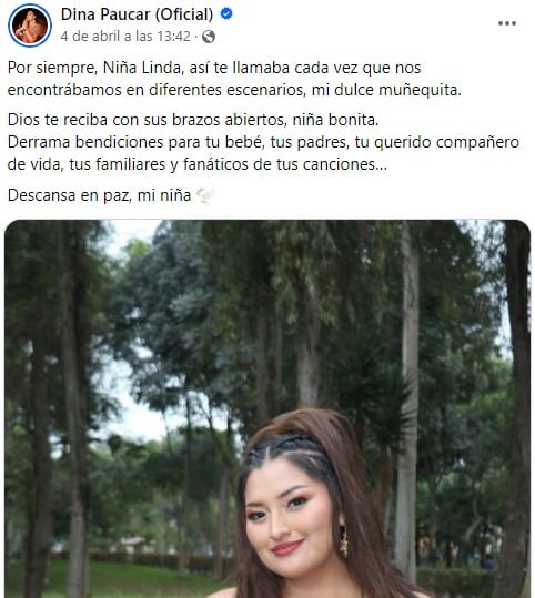 “Descansa en paz, ‘Muñequita’”, termina expresando la intérprete de éxitos como “No me caso”, mientras Dina Paucar hizo lo propio recordando que de cariño la llamaba “Niña linda”, “cada vez que nos encontrábamos en diferentes escenarios”, y asimismo pidiéndole que desde el cielo derrame bendiciones para sus seres más queridos que hoy la lloran y claman justicia.